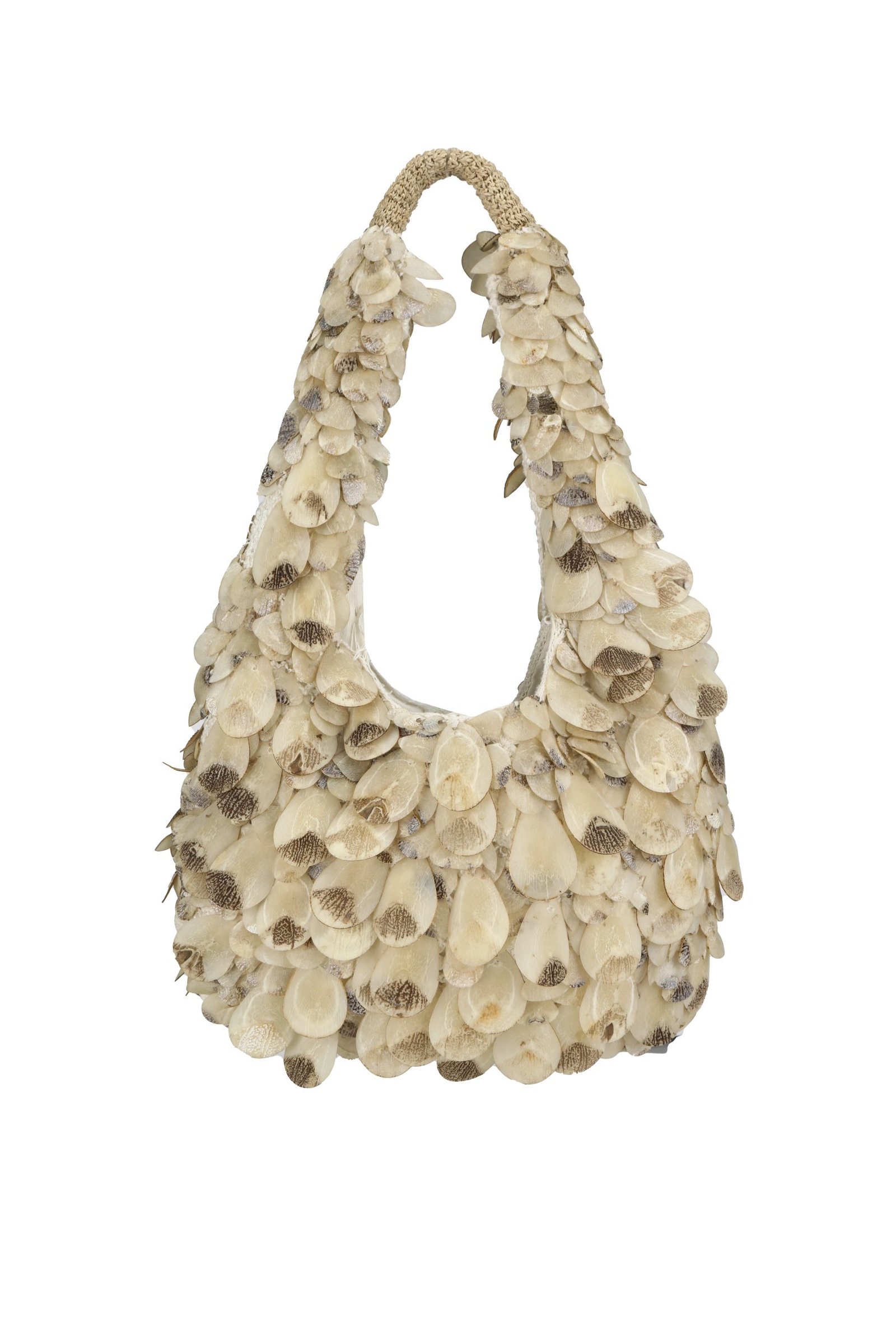 The Half-Moon Crochet Bag bridges tradition and technology, adorned with intricately laser-cut paiche fish scales. These natural sequins, meticulously flattened and processed, lend a unique texture to the bag’s surface. A sturdy handle crafted from natural plant fibers completes the piece, celebrating the fusion of Amazonian techniques and sustainable craftsmanship. This bag embodies a narrative of heritage and innovation, seamlessly uniting diverse artisanal practices.