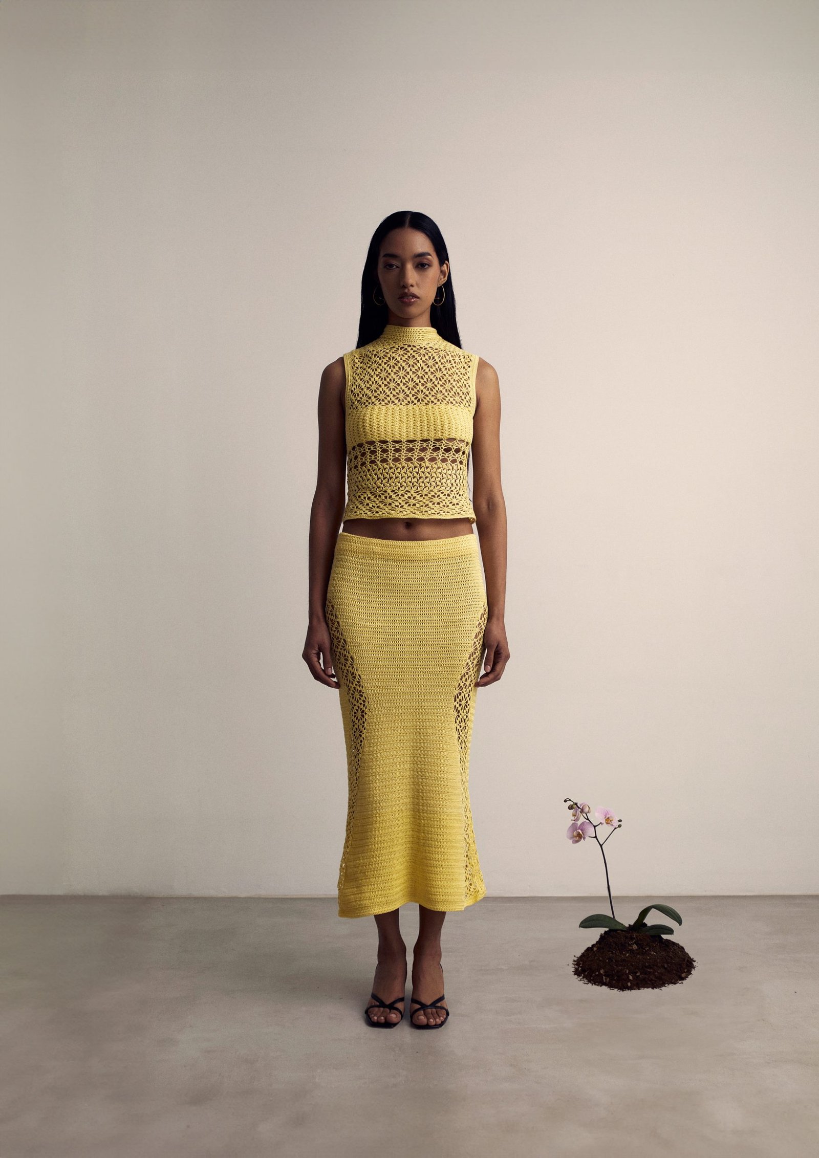 The Manchachi skirt is a handwoven design, crafted with intricate crochet and defined by its structured cut-outs. These details create a fluid interplay of texture and form, shaping a silhouette that flatters while honoring the artistry of its handmade construction.