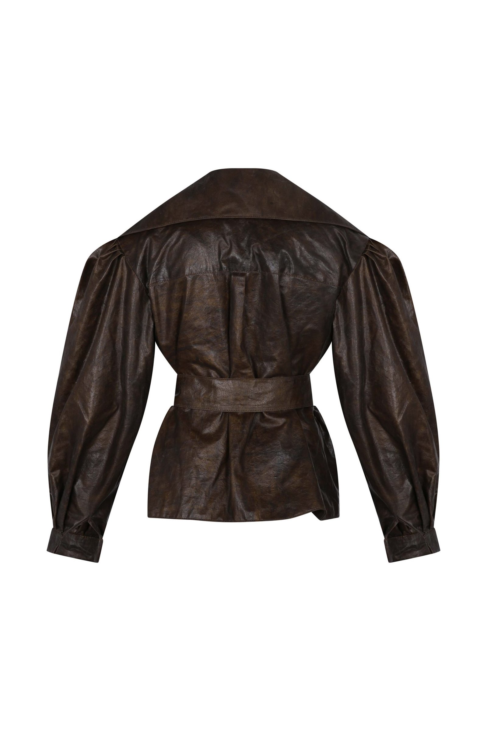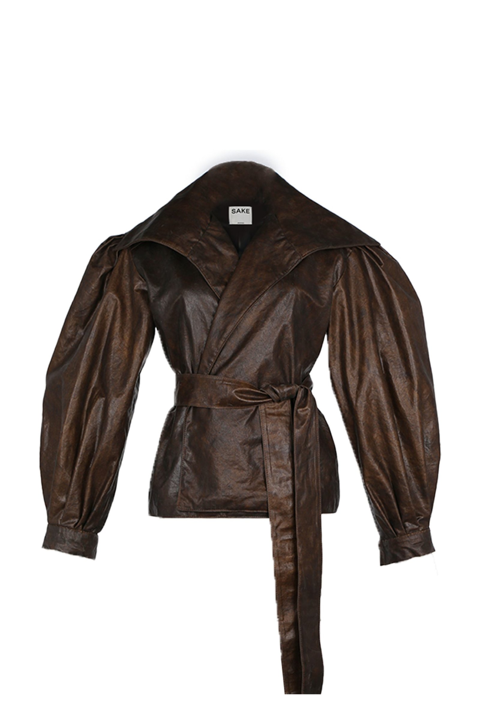 The Qori Jacket made from shiringa, an innovative biomaterial combining cotton and wild rubber from the Amazon, this coat offers a distinctive balance of structure and volume. The oversized angular collar and sculptural puffed sleeves add a bold, architectural touch, making it a standout piece rooted in craftsmanship and sustainable design.